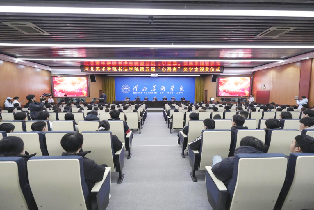 2025年12月12日,河北美术学院书法学院第五届“心吾斋”奖学金颁奖仪式在正成报告厅举行。“心吾斋”奖学金设立者李妙华,河北美术学院举办者、校长甄忠义,常务副校长张建敏,副校长张子言,中国书法家协会学术委员会委员、河北美术学院教授姜寿田,书法学院常务副院长侯东菊,中国书法家协会隶书委员会委员李守银、孙培严、张青山、高岩,中国书法家协会草书委员会委员刘宏卫、朱河山、郑庆伟、栾金广,书法学院副院长李会芳等领导与嘉宾,及学院师生五百余人参加本次活动。活动由书法学院副院长郭云鹏主持。